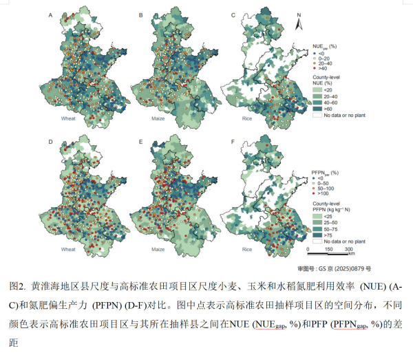 近日,史文嬌研究團隊對高標準農田建設后的氮肥利用效率及其環境影響進行了系統評估。研究對中國黃淮海區開展了大規模問卷調查,覆蓋小麥抽樣縣404個、玉米抽樣縣328個和水稻抽樣縣115個,獲取了高標準農田建設的第一手農田管理及氮肥利用數據。結合縣級統計數據,構建了抽樣縣與抽樣項目區對比的綜合評估體系,評估了氮素利用效率提升和環境影響減緩的成效;針對高氮低效縣設計了不同的減量增效情景,評估了不同減氮情景在區域尺度上的成效潛力。