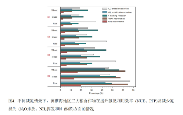 研究發現,高標準農田小麥、玉米和水稻三大糧食作物的施氮強度均顯著低于縣尺度平均水平,氮肥利用率顯著高于縣尺度平均水平,達50.2%-55.2%。氨(NH3)揮發強度較縣尺度平均水平降低了9.9-12.2 kg N/ha,氮淋溶損失減少了6.5-16.9 kg N/ha,氧化亞氮(N2O)排放降低了1.2-1.6 kg N/ha。如果將黃淮海地區三種作物的氮肥施用量均能降至高標準農田管理下的施氮水平,區域尺度上三大作物NUE可提升12.9-19.5%,氮淋溶、NH3揮發以及N2O排放可減少37.4-66.5%。研究揭示了高標準農田建設在實現糧食安全與資源高效的雙贏突破,為高標準農田建設提供了成效評價的量化依據與未來規劃的政策參考。