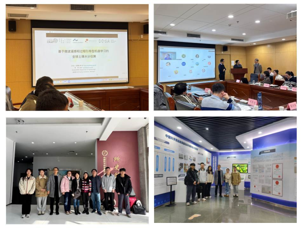 丹麥奧胡斯大學王盛教授團隊馮思嘉博士生(左上)線上報告、會議互動(右上)、會議代表參觀中國科學院地理科學與資源研究所所史館(左下)和院陸地水循環及地表過程重點實驗室(右下)